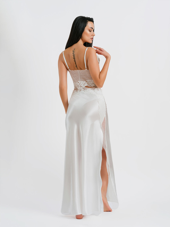 Celebrate your femininty with this sophisticated long nightdress. The bodice is made of full elastic lace to provide the perfect fit, the buttom part is made with soft satin with a side slit and lace finishing. Adjustable shoulder straps. Machine washable. 100% polyester.