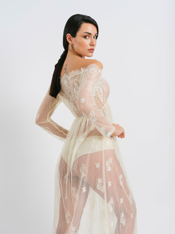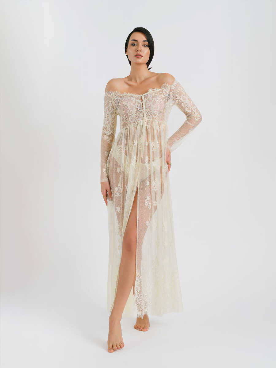 Zarif dantel ve şık omuz tasarım görkemli tek parça gecelik, transparan detayı ile şık ve seksi ol.